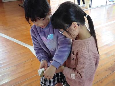 最後に3年生は、手作りお守りのプレゼントと肩もみトントンを行いました。肩もみトントンは、3年生だけでは人数が足りなかったため、2~6年生が参加して行いました。