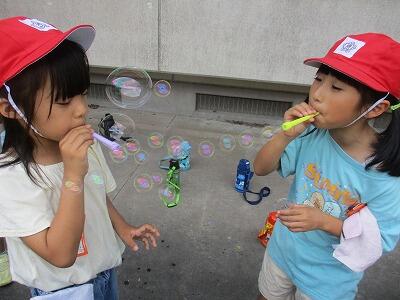 息の吹き込み方の強弱でしゃぼんだまの大きさが変わったり、風が吹いてくるのに合わせてしゃぼんだまをとばしたりして楽しみました。