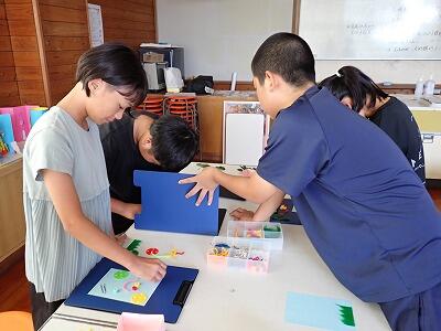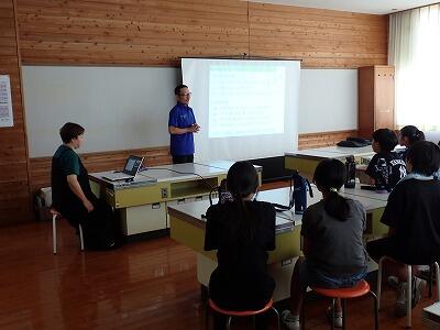 高鍋高校にアメリカから留学生として来日している3名と引率の先生1名との交流会が7月3日(木)にありました。6年生は、外国語の学習の一環として「留学生と英語で交流しよう」というめあてで学習しました。