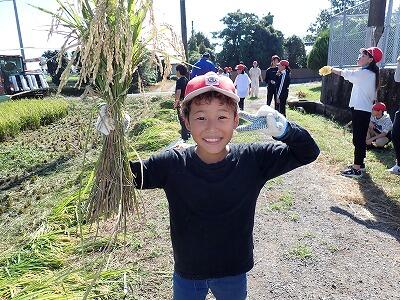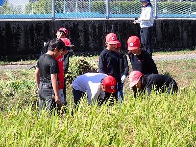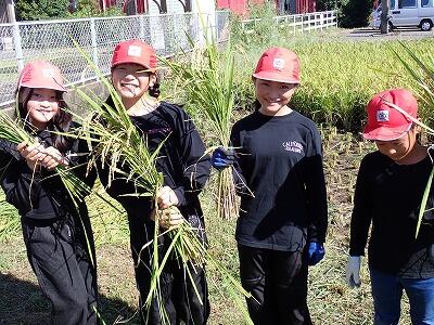 9月17日(水)、5年生が学校田で育てたもち米の稲穂が金色に輝き、頭を垂れています。収穫の秋といっても、まだまだ日差しが暑く、ジリジリと照り付ける中、JA青年部の方に手伝ってもらって稲刈りをしました。腰を曲げて一束一束稲を鎌で刈っていきます。一束刈るたびに「腰が痛い。疲れた。暑い。」という5年生。収穫することの大変さが身に染みたのではないでしょうか?