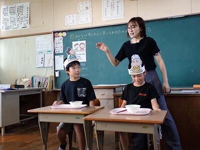 川南小の栄養教諭の先生に来ていただいて食育の授業が行われました。1年生は「食事のマナー」について、5年生は「五大栄養素」について学習しました。1年生はワークシートで自分のマナーを振り返りました。食事前に手洗いを忘れたり、ひじをついて食べたり、マナーが守れていないことに気付いていました。5年生はバランスよく何でも食べることが健康な体づくりにつながることを理解することができました。栄養教諭の先生の授業が分かりやすく、食について楽しく学ぶことができました。