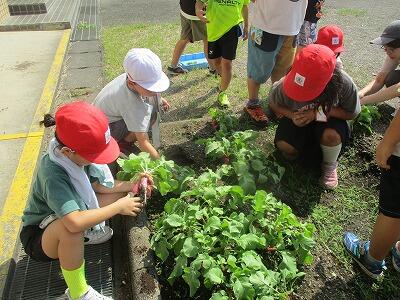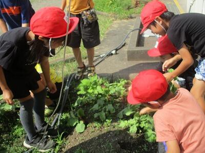2年生は、生活科の学習で夏野菜を育てています。一人一鉢ではミニトマトを育て、教室横ではミニトマトだけでなくキュウリ・ゴーヤ・ししとう・タカノツメを育てています。また、体育館の裏手の畑では、サツマイモとピーマンを育てています。