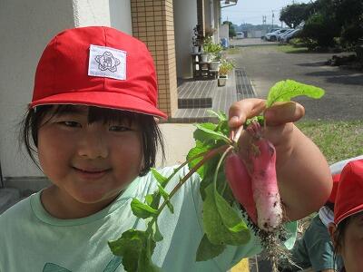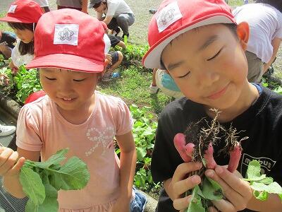 大きな農業用機械に乗って作業をする人を見つけました。「何をしているのかな?」と、みんなで考えて話し合いました。緑の葉っぱを大きく広げる野菜も見つけました。「大根かな?キャベツかな?それとも白菜かな?」と、やっぱりみんなで考えました。見て疑問に思ったことをみんなで解決しようと、考えを出し合って話し合うのは、とても楽しそうです。