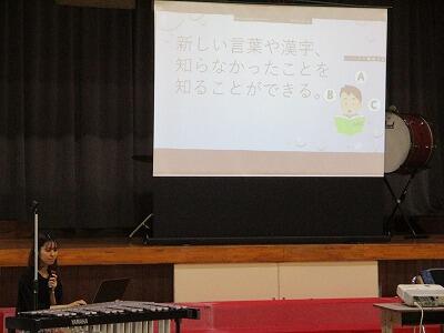 まず初めに、担当職員が「読書のよさ」についてスライドを使って話をしました。