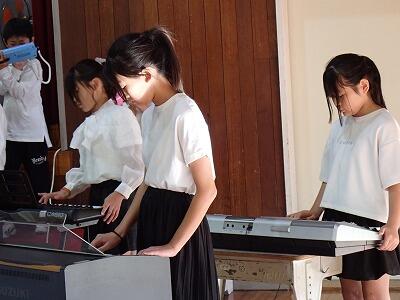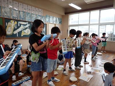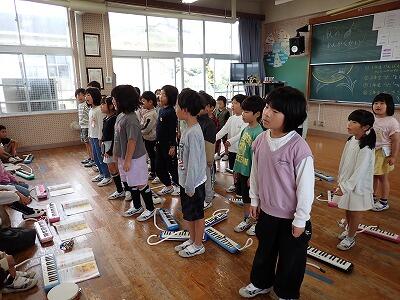 まず初めに、1年生がグループごとにけんばんハーモニカでの「ドレミのれんしゅう」を演奏しました。