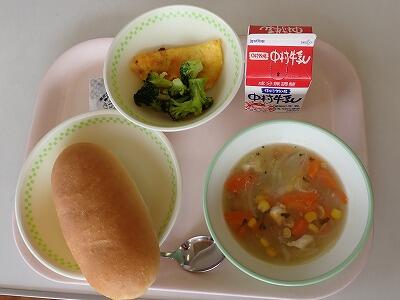 この日の給食は「パン、コーンスープ、オムレツ」でした。