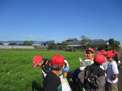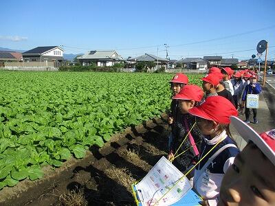 10月28日(火)、2年生が町探検に出かけました。今回の探検場所は学校周辺です。学校の周りには畑が広がっています。