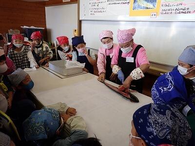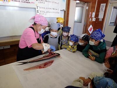 10月29日(水)、地域の「チームがはは」の方を講師にお迎えして、3年生が「浜うどん」作り教室をしました。うどん麺の原材料になっている“シイラ”も見せてもらいました。最近はシイラの水揚げがなかったそうですが、幸運にも授業の前日に取れたということで、さばくところを実演してくださいました。