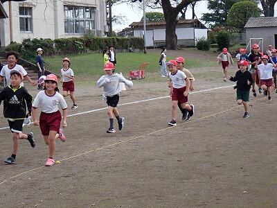 下学年がトラックの内側を、上学年がトラックの外側を、5分間走りました。普段運動している子は軽快に走る姿が見られました。