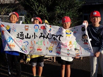 3年生が朝のあいさつボランティアをしています。「通山小みんなであいさついっぱいがんばるぞ」と書かれた3年生手作りの横断幕を持って、朝早くから校門に立ってくれています。