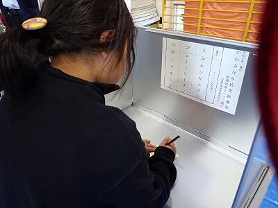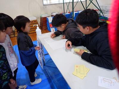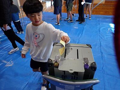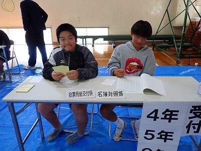授業後の給食をはさんだ昼休みには、6年生が運営管理する中、全校児童が体育館に入場券を持って集まり、模擬投票が行われました。今回の選挙は、かわみなみおすすめ給食総選挙!①チキン南蛮②コーンラーメン③ポークカレーのどれかを選ぶというものでした。