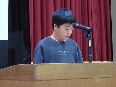 まず初めに、2年生の代表児童が「いいところいっぱい」と題した2学期を振り返っての作文を発表しました。