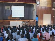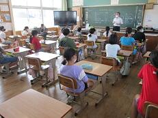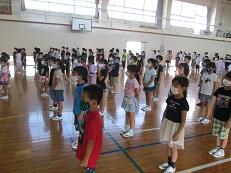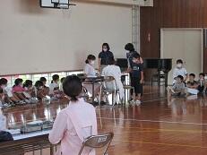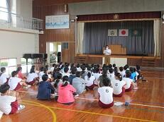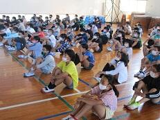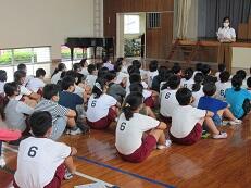 今日は1学期終業の日でした。子どもたちは2校時に体育館に集まり、終業式に参加し、その後、夏休みの過ごし方について担当の先生から話を聞きました。