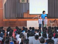 全校朝会で、10月の目標について担当の先生から話がありました。