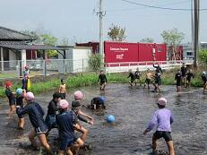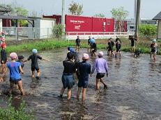 今日は、代掻きも兼ねて、田植えをする前に「ドロリンピック」を行いました。田んぼの中で、グループ対抗リレーやドッジボールをして楽しみました。泥にまみれて思いっきり体を動かす子どももいれば、できるだけ汚れないようにしている子どもなど、様々でしたが、子ども時代のこのような体験を大切にしたいと考えます。