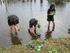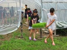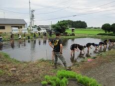 これまで育ててきた苗を田んぼに運び、JA青年部の方々から植え方を教えていただき、一列に並んで植えていきました。ロープを張り、そのロープについている目印に合わせて植えていくやり方です。子どもたちは、だんだんと慣れ、楽しそうに植えていました。今後の成長を見守りながら、収穫を楽しみにしています。JA青年部の方々、いつもありがとうございます。