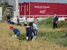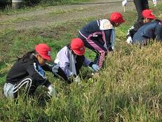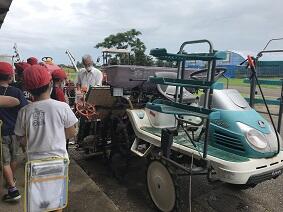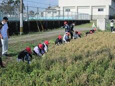 今日、JA青年部の方々の協力のもと、5年生が稲刈りを行いました。鎌を使い、慣れない手つきで稲刈りをしていきましたが、徐々に上手に刈れる児童も出てきました。時間的に全部の稲を手で刈ることはできませんので、残りはJA青年部の方々にコンバインで刈っていただきました。収穫した米は、11月下旬に餅つきに使う予定です。JA青年部の方々のご協力のおかげで、貴重な体験ができることに感謝です。