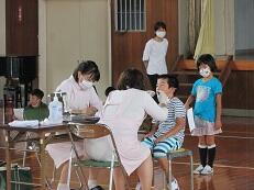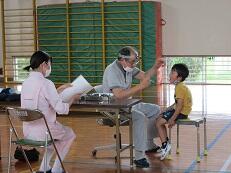 眼の疾病及び異常の早期発見、視機能の低下を予防するために、眼科検診を行いました。対象者は、1年生全員と、2~6年生で事前の問診票で抽出した児童です。川南町には眼科がないので、高鍋町から眼科の先生に来ていただいて実施しています。最近は、ゲームやSNSを利用する児童も増え、目の健康だけでなく、昼夜逆転の生活等も問題になってきています。