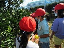 2年生が県立農業大学校で「ミカンの収穫体験」をしてきました。農業大学校の方から、おいしいミカンの選び方や収穫の仕方について説明を聞き、収穫を体験しました。収穫後は、おいしいミカンをおなか一杯食べることができました。その後、農業大学校の施設を見学させていただき、帰りには、収穫したミカンを重たそうに抱えて学校まで帰りました。