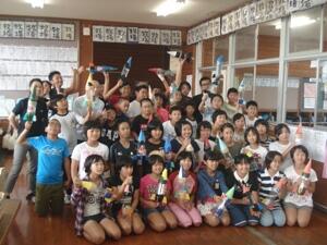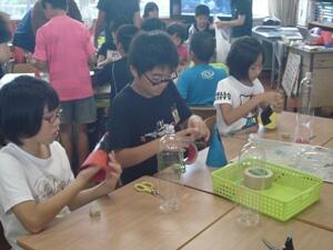 6年生を対象に、JAXA(宇宙航空研究開発機構)職員による「宇宙教室」が開催されました。はじめに、日本のロケットの紹介等をしていただいた後、ロケット組立から打ち上げまでの様子を動画を使って見せていただきました。その後、「反動」の力を利用した水ロケットを作り、運動場で実際に飛ばしてみました。子どもたちは、実際にロケット開発に取り組んでいらっしゃる方の話を興味津々に聞いていました。水ロケットの発射実験では、遠くに飛ぶロケットに歓声を上げていました。子どもたちにとって「宇宙」が近くに感じられた時間だったようです。