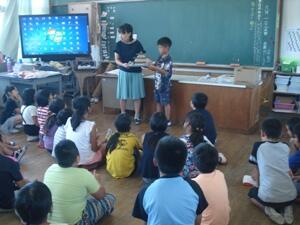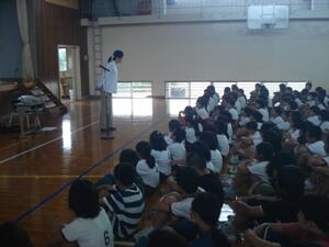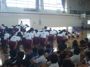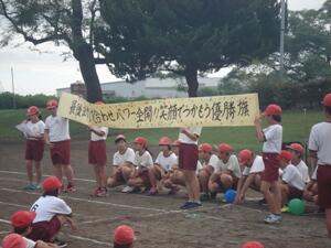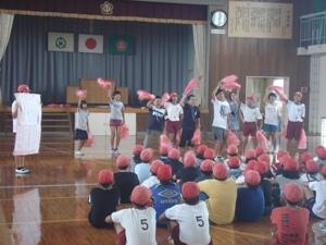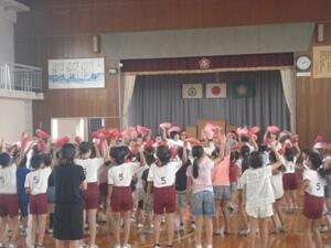 今日7月21日は、1学期の終業日です。終業式では、3年生の代表児童が1学期にがんばった水泳や話合い活動などについて作文に書いて発表してくれました。校長先生の話では、各学年ごとに、1学期がんばったことや成長したことについての紹介がありました。また、登校班で、毎日気持ちのよい挨拶ができている児童の紹介もありました。今後も、それぞれ目標をもって、さらに「頭」と「心」と「体」を鍛えていってほしいと思います。終業式終了後に、7月24日の町の水泳記録会に出場する児童の紹介と壮行会がありました。全校児童で5,6年生の代表児童にエールを送りました。水泳記録会も楽しみです。