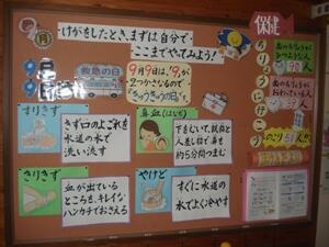写真は、保健室からのお知らせの掲示コーナーの様子です。9月の掲示は、「けがをしたときの応急処置の仕方」です。けがをしたとき、保健室を利用しますが、その前に自分でできることがあります。最近は、この応急処置を行って来室する子どもたちが増えています。また、高学年が1年生に応急処置をした上で連れてきてくれることもあります。「自分でできることを考える」…生活する上で大切なことです。このコーナーには知っておくと役に立つことが毎月掲示されます。子どもたちも興味をもって見ています。