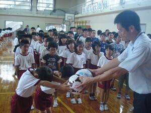 全校朝会が行われました。今日は、今月の目標「気持ち良いあいさつをしよう」に関しての話がありました。まずは、普段の登校時の様子を映像で振り返りました。そして、声の大きさや礼の仕方に気を付けることを確認した後、注意する点を意識しながら、実際にあいさつをする練習を行いました。いつでもこのようなあいさつを心掛けておきたいものです。その後、計算検定の表彰、ベルマークで購入したボールの贈呈を行いました。各家庭でのベルマーク収集へのご協力ありがとうございました。