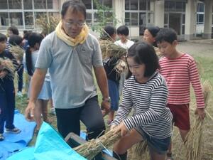 5年生の子どもたちが、人力での脱穀作業を行いました。脱穀したのは、稲刈りした後に掛け干ししていた稲です。学校近くの古屋様から足踏み式脱穀機をお借りして、子どもたちに脱穀体験をさせていただきました。子どもたちは、昔の道具の素晴らしさを実感していたようです。