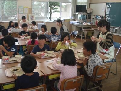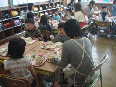 今日は、給食試食会を行いました。通山小学校では、全学年で希望者を募って試食会を行っています。今日も、40名の参加がありました。まず、本町の栄養教諭に学校給食の現状(給食供給数、給食費など)や地産地消、家庭で取り組める食育などの話をしてもらいました。その後、各教室に分かれて、子どもたちと一緒に会食をしました。子どもたちも、いつもと違う雰囲気で楽しく食べていたようです。参加された保護者の方々には、「家では食べないものも、わが子が食べていた。」「家でも、栄養のバランスを考えた献立を考えなければ。」など、さまざまな気づきや今後の家庭での取組についての感想をいただきました。
