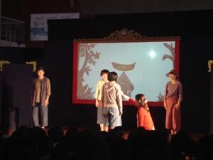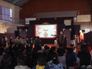 観劇教室を実施しました。劇団「風の子九州」による「バンバンとトラ」という役者による演技と影絵を組み合わせた劇でした。子どもたちは、その面白さと珍しさに引き込まれていました。終了後には、舞台裏も見学させていただきました。芸術の秋にふさわしい行事でした。