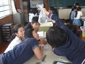 5年生は、理科の学習でこれから飼っていく「メダカ」を初めて観察していました。オスとメスはどこで見分けるのか、小さいメダカに神経を集中させていました。