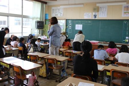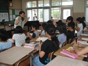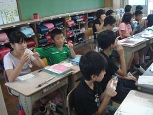 1日は参観日でした。暑い中でしたが、1学期最後の参観日に多くの保護者の皆様に出席していただきました。今回は、町の「さざんか教室」の皆様や「学校関係者評価委員」の方々にもおいでいただきました。参観では、ふだんの教室での学習だけでなく、体育館での理科の授業(3年)、音楽室での授業(4年)、家庭科室での授業(5年)も参観していただきました。5年生の家庭科の学習では、保護者やさざんか教室の方々にもお手伝いいただきボタン付けの実習を行う姿も見られました。