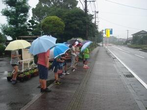 今朝は、昨日までの暑い日とは一転して、時折強い雨も降る天候となりました。こんな雨の日でも、子どもたちが登校班できちんと歩いて登校する姿が見られます。上級生が班長となって先導してくれるお陰です。荷物を持ってカッパを着て傘も差してという1年生もいましたが、上級生が一緒に歩いてくれるので、頑張って登校していました。班長さんたちに感謝です。