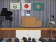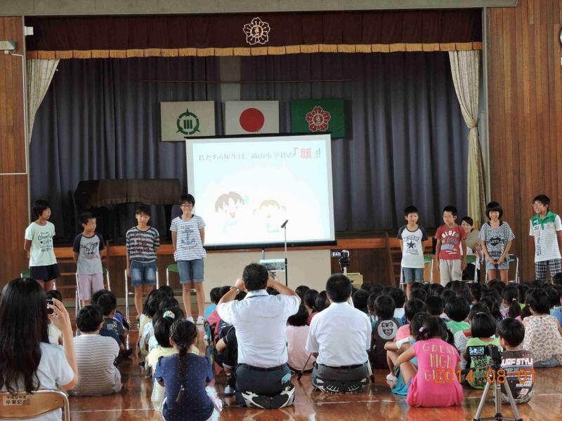 ・全員登校した日………0日 2学期は、全員登校する日が早めに実現するように「体を鍛える夏休み」を過ごして欲しいと思います。保護者の皆様の応援をお願いします。写真は1学期の反省と、2学期の抱負を述べている代表児童の様子です。代表の3年生2名、すばらしい発表でした。