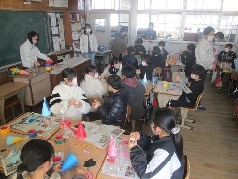本年度のふれあい活動は、1年「昔の遊びをしよう(通山長寿会・保護者)」、2年「クリスマスリースづくり(保護者)」、3年「くぎうちトントン(保護者)」、4年「絵手紙づくり(地域指導者・保護者)」、5年「餅つき(保護者)」、6年「生き方教室(町長・保護者)」でした。それぞれの学年で楽しい交流が行われました。