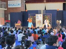 鑑賞教室で、劇団「風の子九州」による『どんぶらこっこ どんどこ亭』という音楽劇を鑑賞しました。これは、日本とアジアの国々の伝承遊びやわらべ歌を取り入れた音楽劇です。コロナ感染予防のため、体育館の窓を開放した寒い中での鑑賞でしたが、子どもたちは劇団の演技に見入っていました。