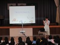 6月3日(火) 6月の月目標は「むし歯をなくそう」です。むし歯ができてしまったら、早めに治療しましょう。早めに治療すると、3つのよいことがあります。1 痛みが少なくてすむ。 2 治療が早めに終わる。 3 治療費が少なくすむ。写真は全校朝会の先生のお話の様子です。
