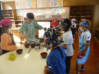 2年生は生活科の学習で、自分たちで育てた野菜を使った味噌汁づくりを行いました。
