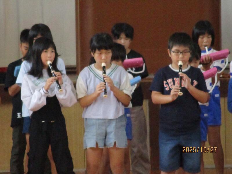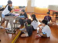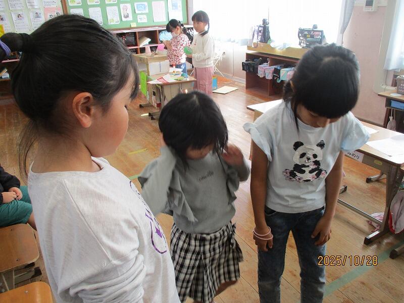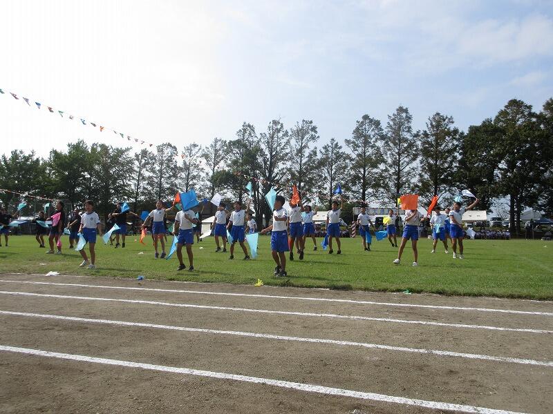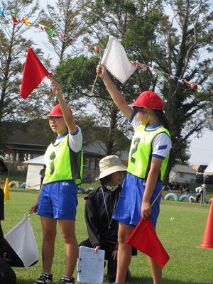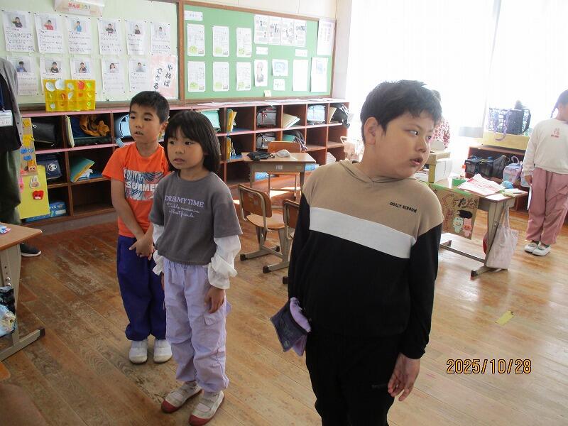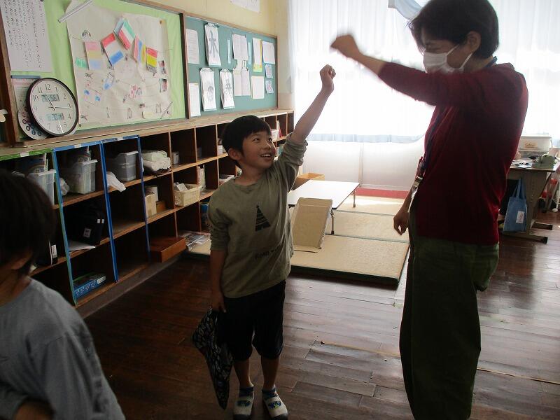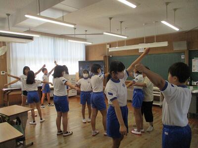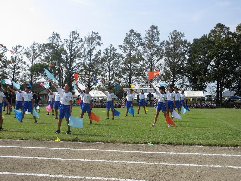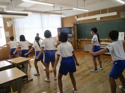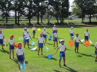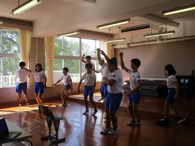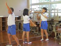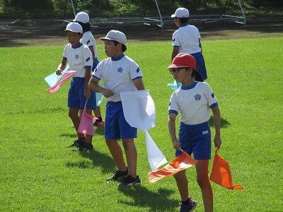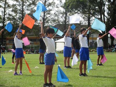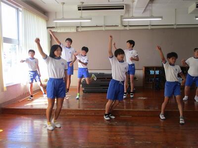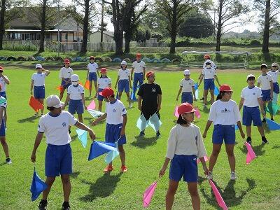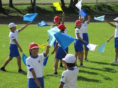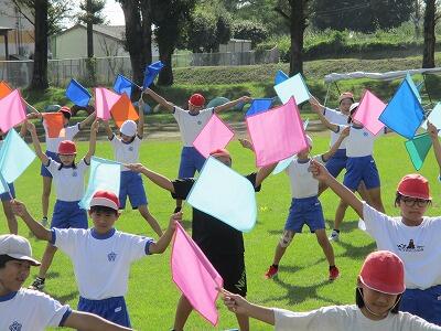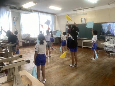 運動会に向けてフラッグの練習をしていました。フラッグを曲に合わせてなびかせる姿が、頼もしく見えました。教室は狭いため、児童会室と2か所に分かれて練習を行っていました。