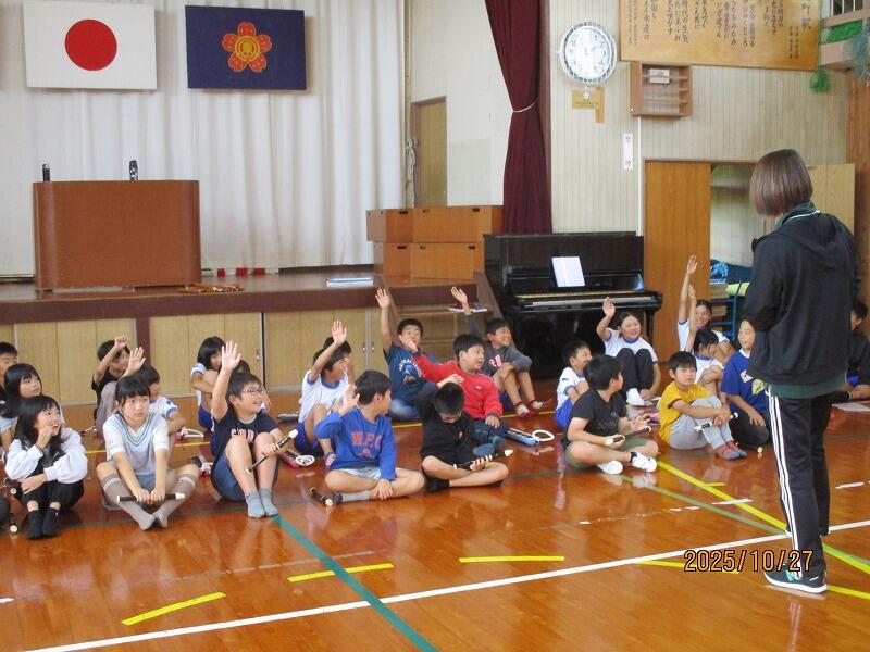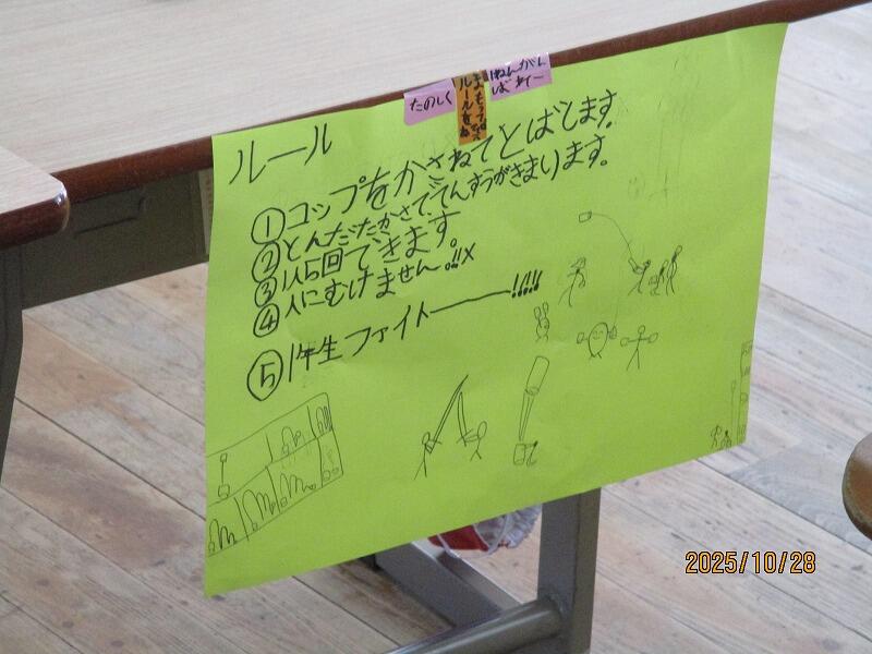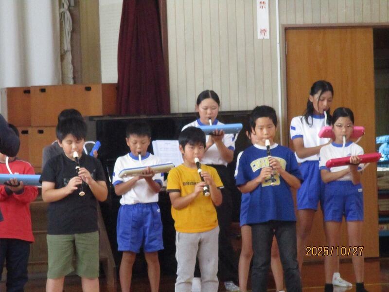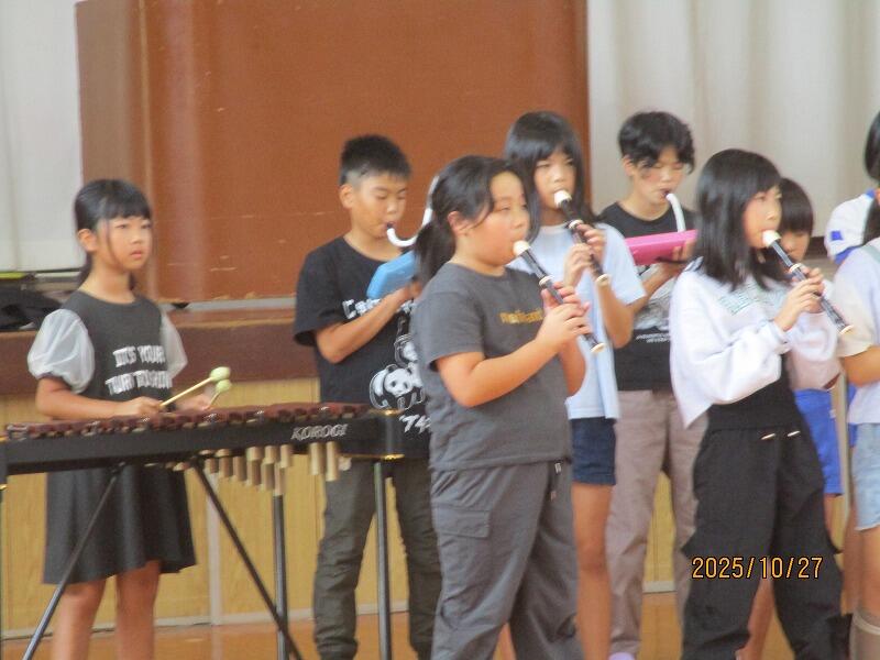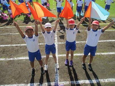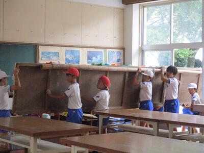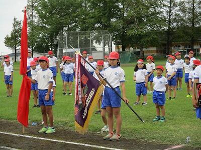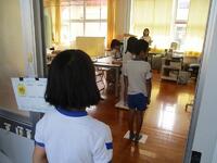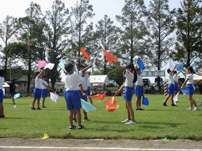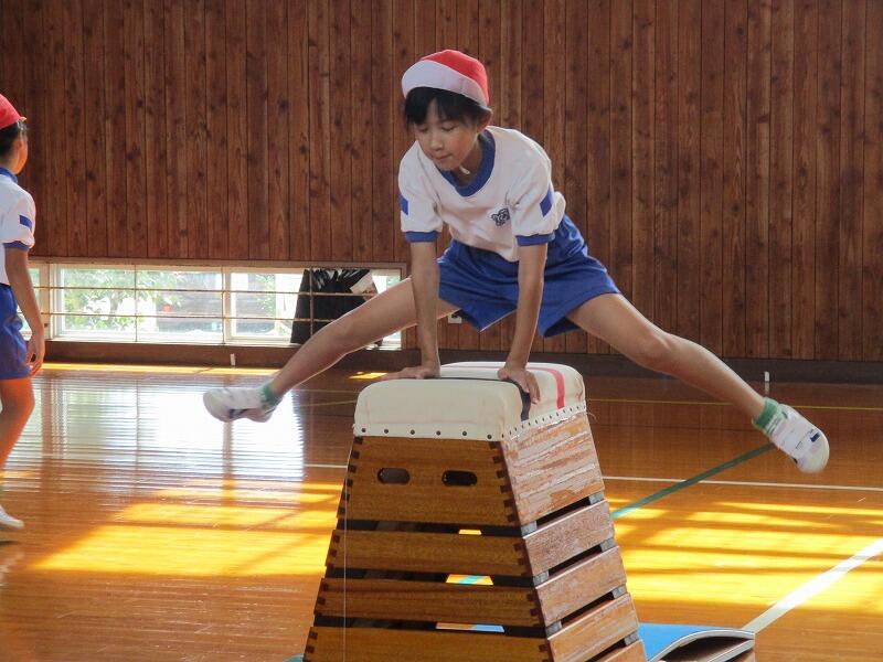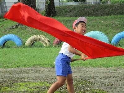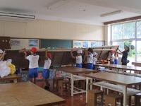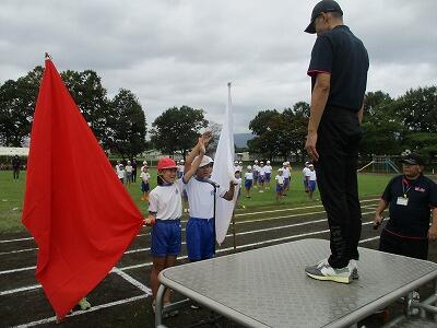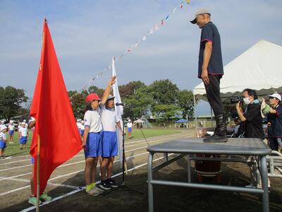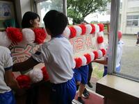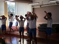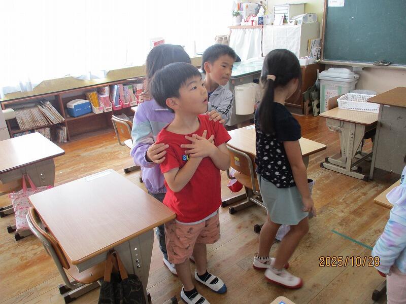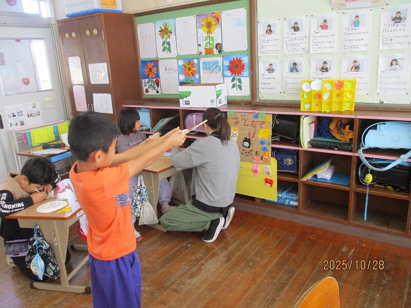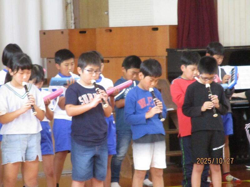 運動会に向けてフラッグの練習をしていました。フラッグを曲に合わせてなびかせる姿が、頼もしく見えました。教室は狭いため、児童会室と2か所に分かれて練習を行っていました。