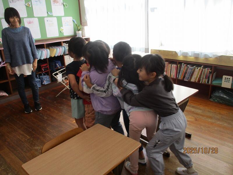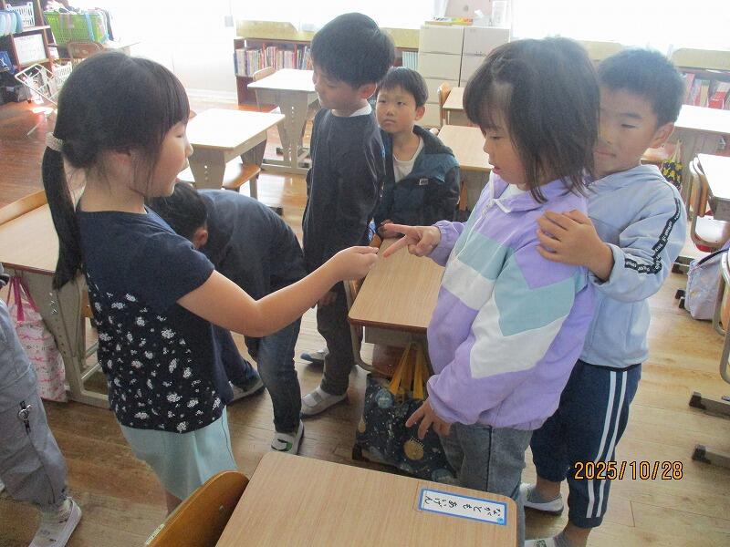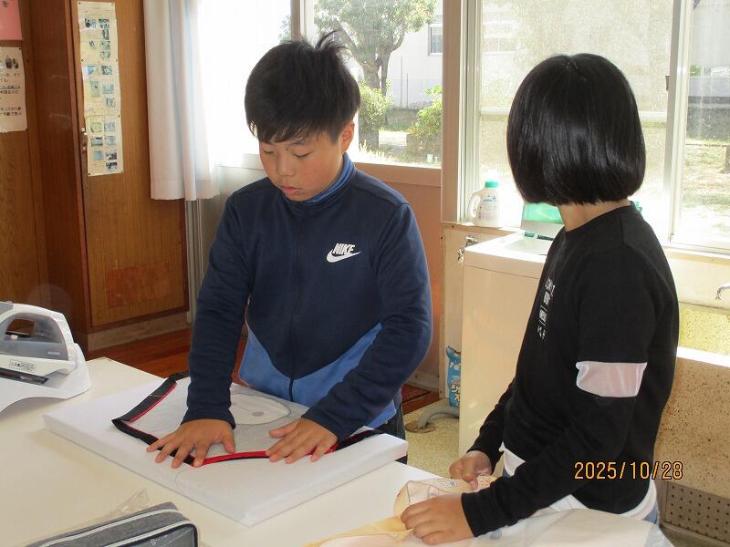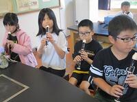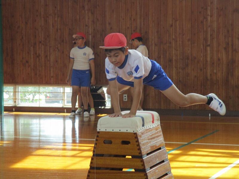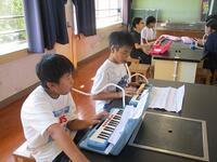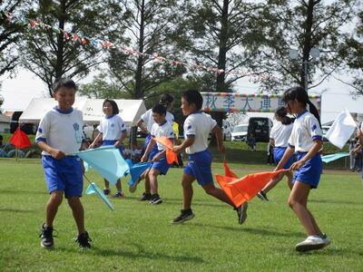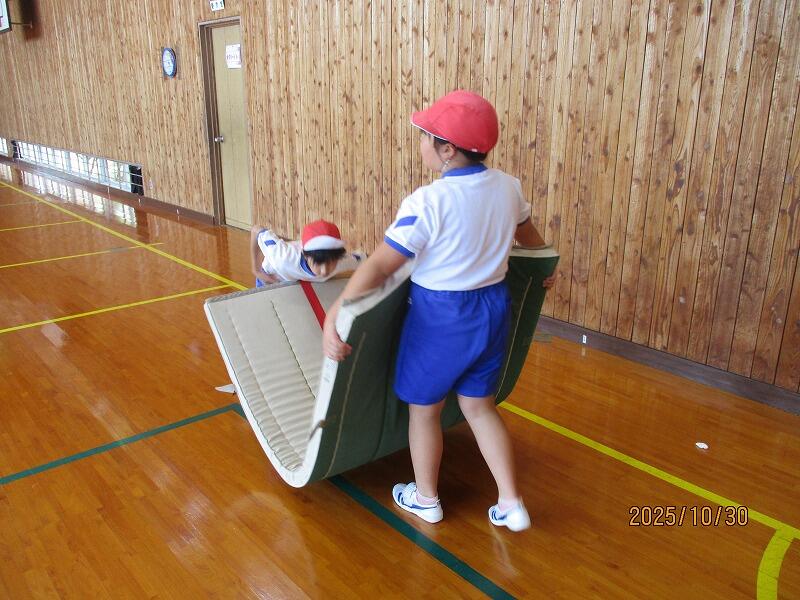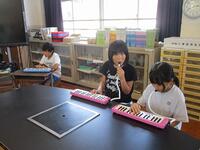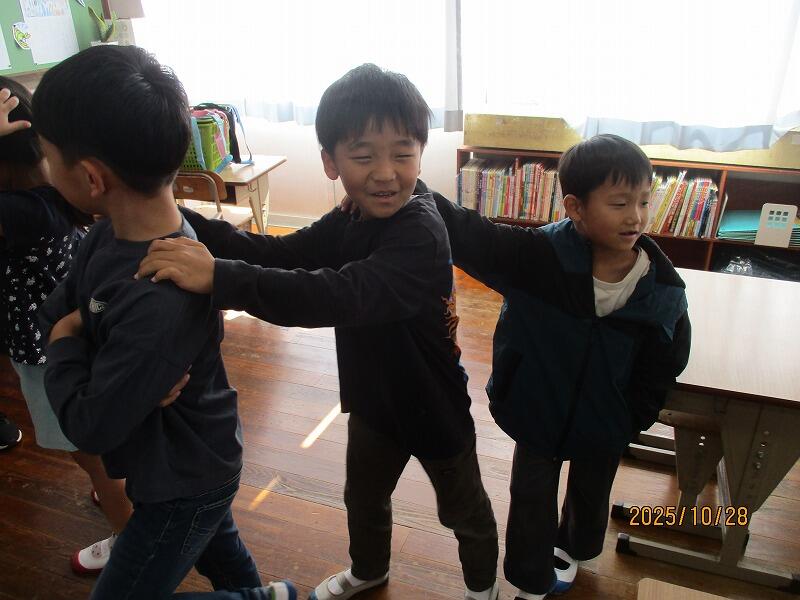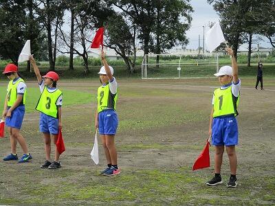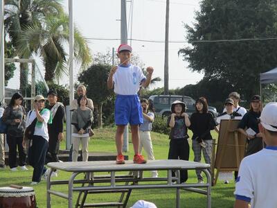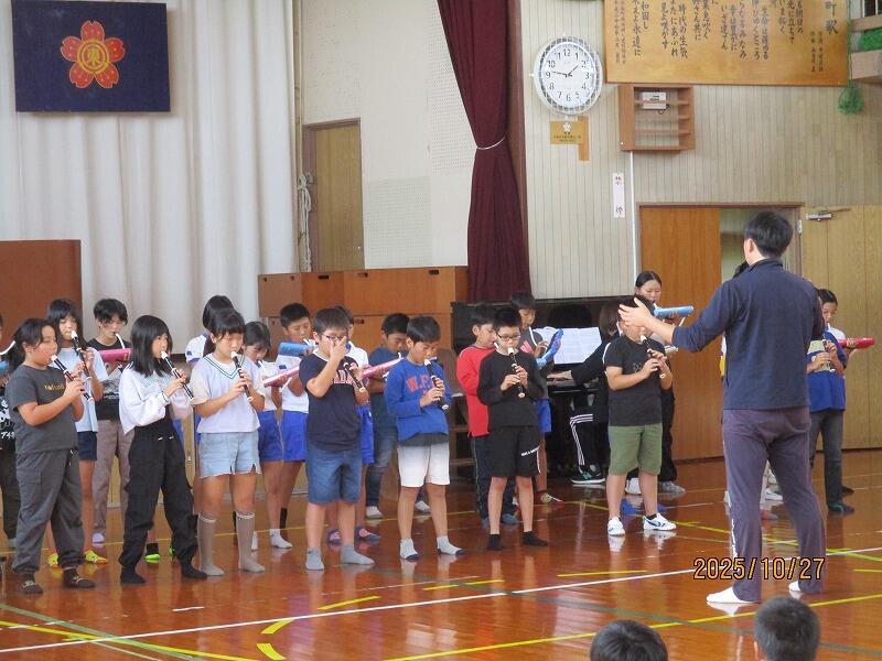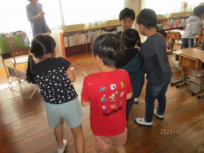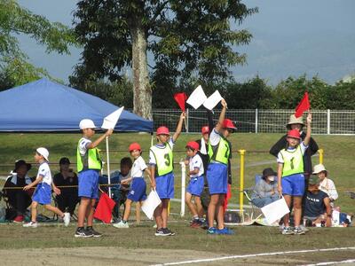 運動会に向けてフラッグの練習をしていました。フラッグを曲に合わせてなびかせる姿が、頼もしく見えました。教室は狭いため、児童会室と2か所に分かれて練習を行っていました。