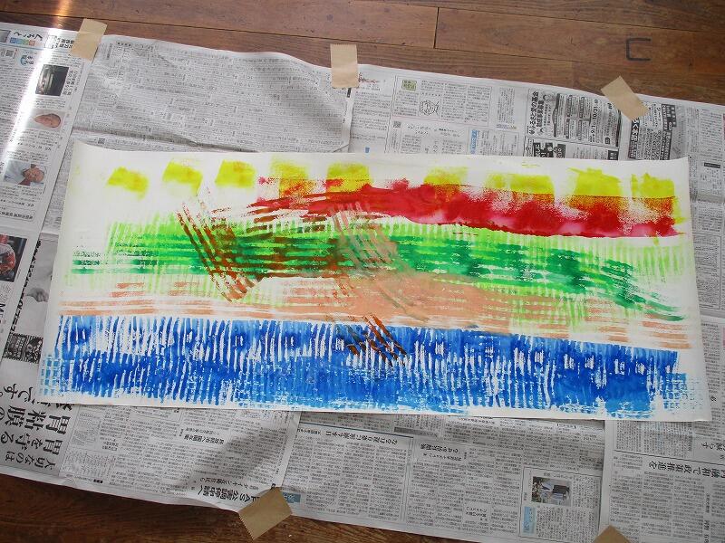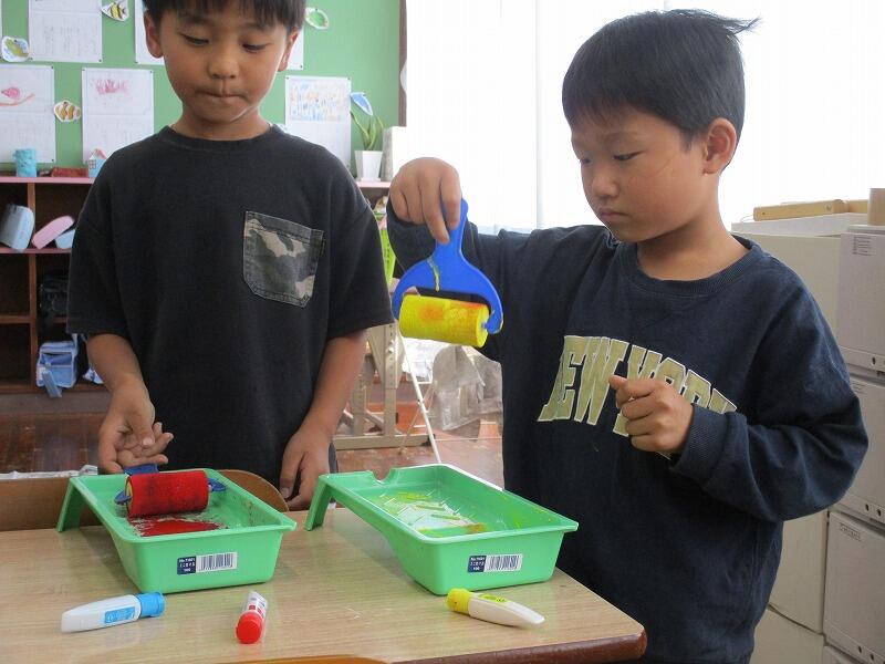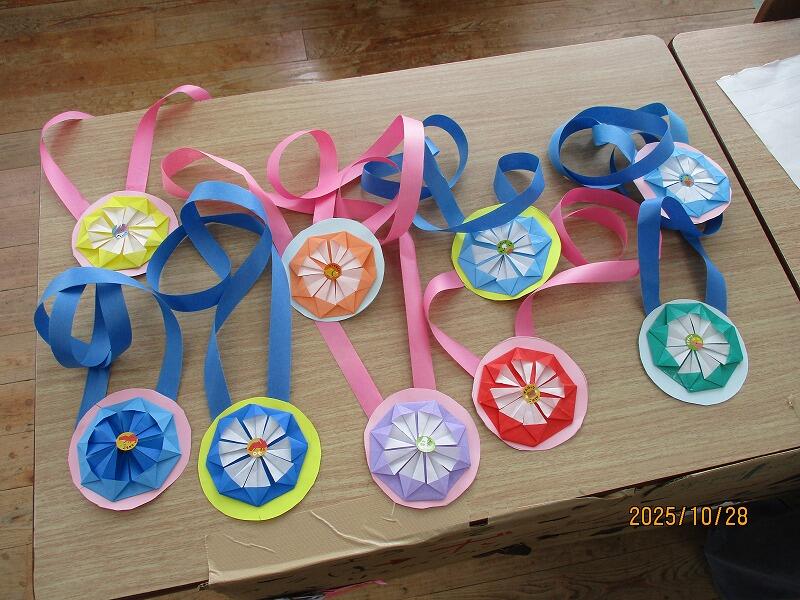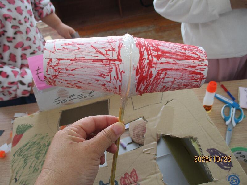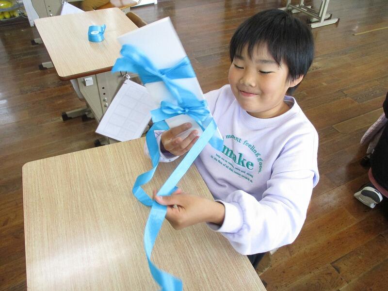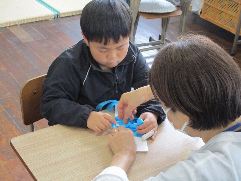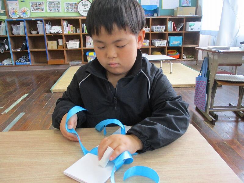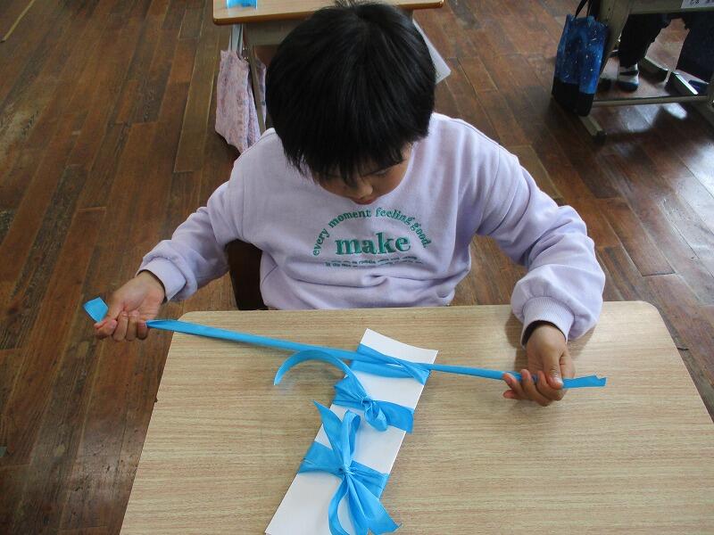 上手になってくると、自分の力だけでクルっと画用紙にリボンを巻き付けることもできるようになりました。