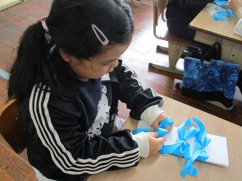 リボンを折りたたんだ画用紙に1回巻き付け、かた結びを1回した後、リボン結びをしていきます。