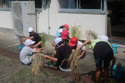 5年生がバケツで育てた稲が実り、収穫の時期を迎えました。