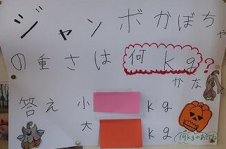 おすず2組で大切に育てていたジャンボカボチャが収穫の時期を迎えました。大きく実ったカボチャの重さを量り、クイズにしました。