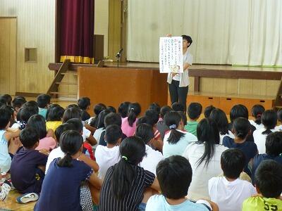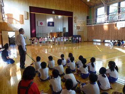 4校時の終業式では、まず、校長先生より各学年の子どもたちの1学期のがんばりや成長についてお話がありました。次に、夏休みの生活について3名の先生方が話をしました。そして、26日の水泳記録会に出場する5・6年生の紹介もありました。