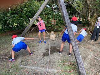 昼食を終え、フィールドアスレチックを行っています。この時間、東小だけがこの活動のようで、なんだか広々とフィールドを使っているようです。カヌーや水上のアスレチックは少し怖いかも・・・。落ちないように気を付けて!