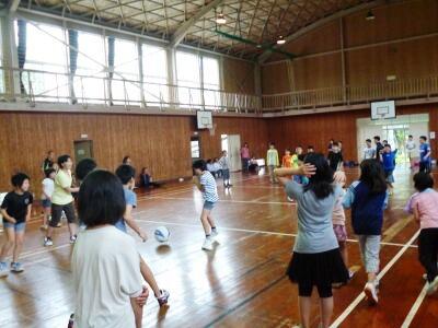 学校の体育館で、「色ミニバレー」、「カローリング」、「アジャタ」、「バスケットボール」などを親子で楽しみました。役員の方々が、いろいろな用具や器具を準備してくださっていたので、楽しく活動することができました。