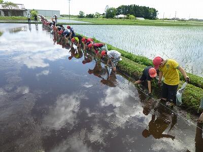 晴天に恵まれ、JA青年部の方々のご指導のもと、PTA事業部の方々や5年生の保護者の皆様の御協力をいただき、子どもたちは泥だらけになって苗を植えました。