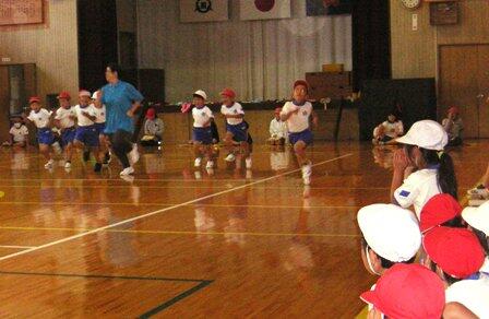 これは新体力テストの種目で、20mの幅のラインの間を何回往復できるかを計る、いわば持久走です。でも1年生は、正確に数えることが難しいので6年生がお手伝いをしてくれました。